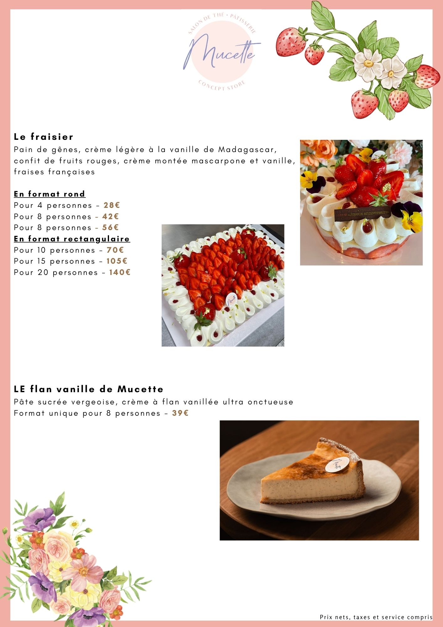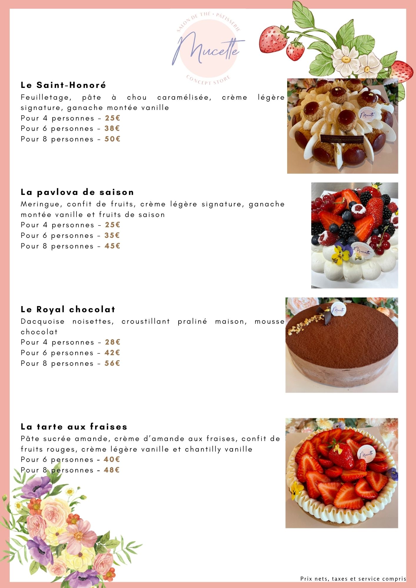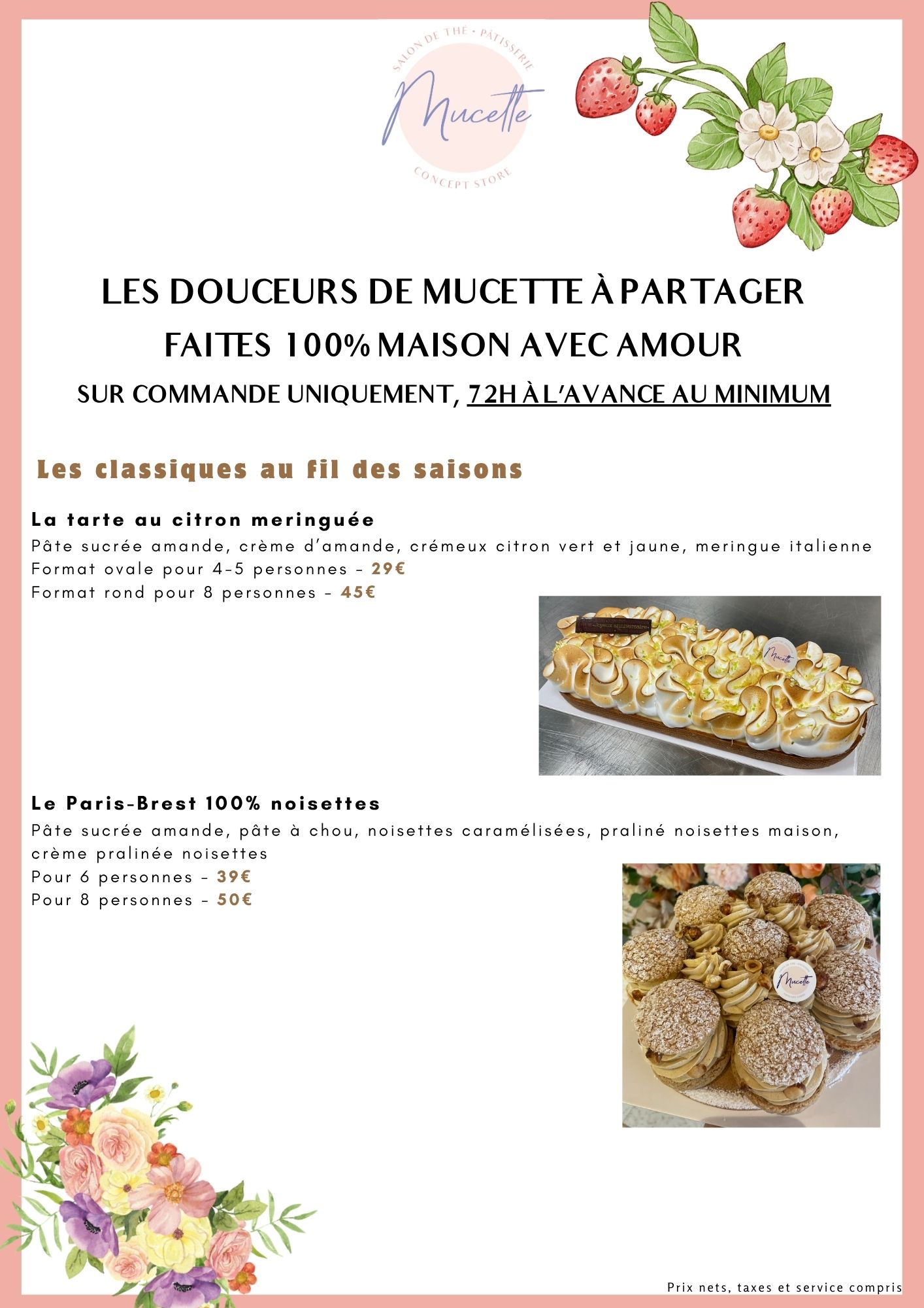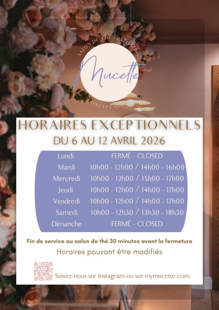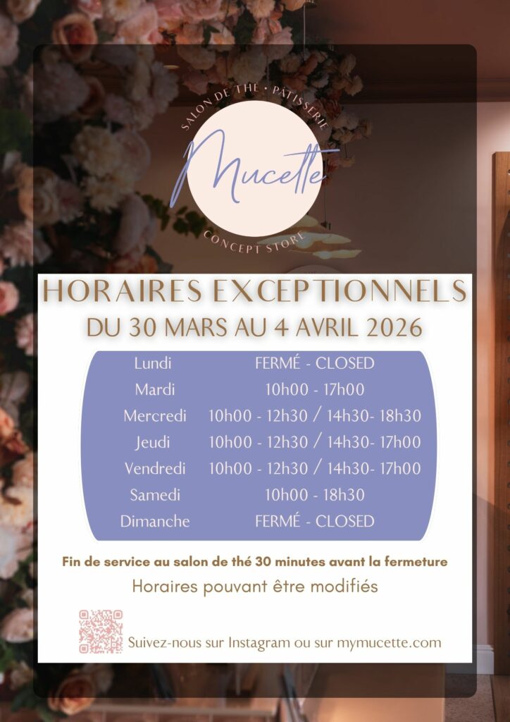Vos pâtisseries préférées sont en vente sur place et à emporter et sur commande par mail à bonjour@mymucette.com ou par téléphone au 01 60 04 39 67.