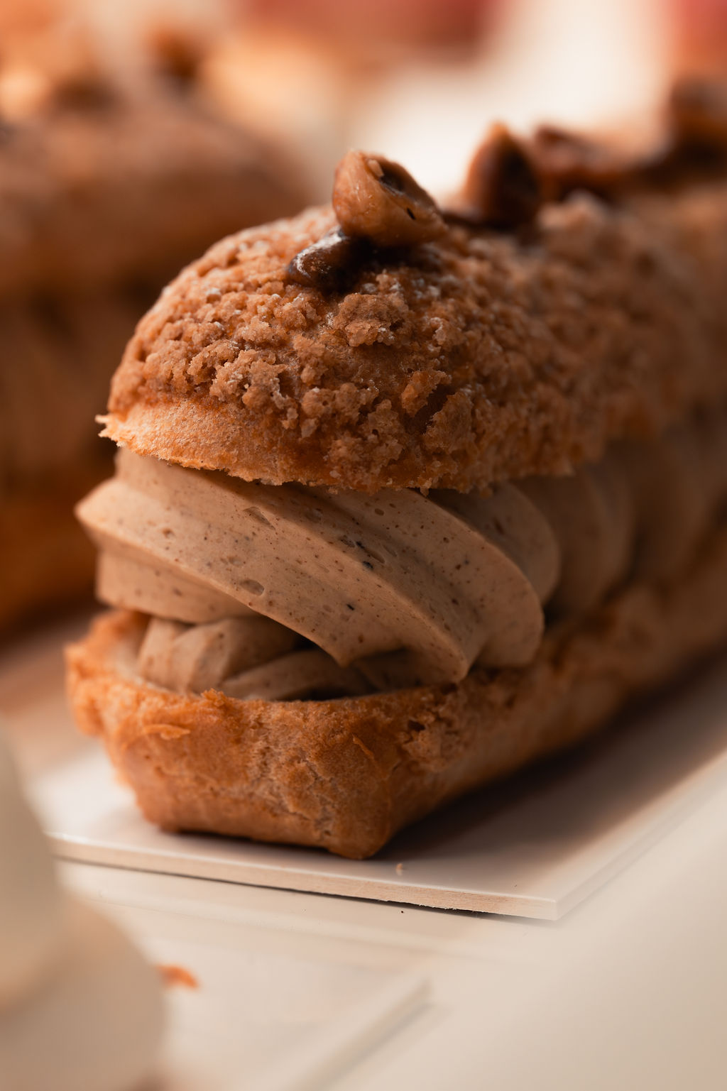 Pâte à choux garnie d’un crémeux noisette, d’un praliné maison 100% noisettes et de noisettes caramélisées.